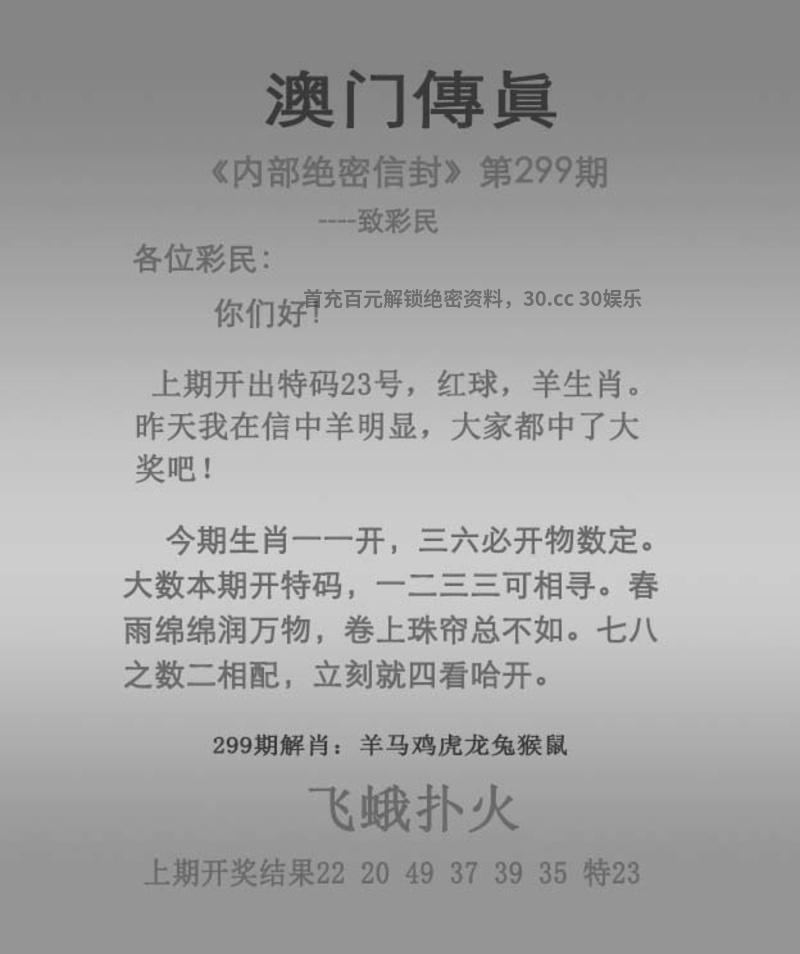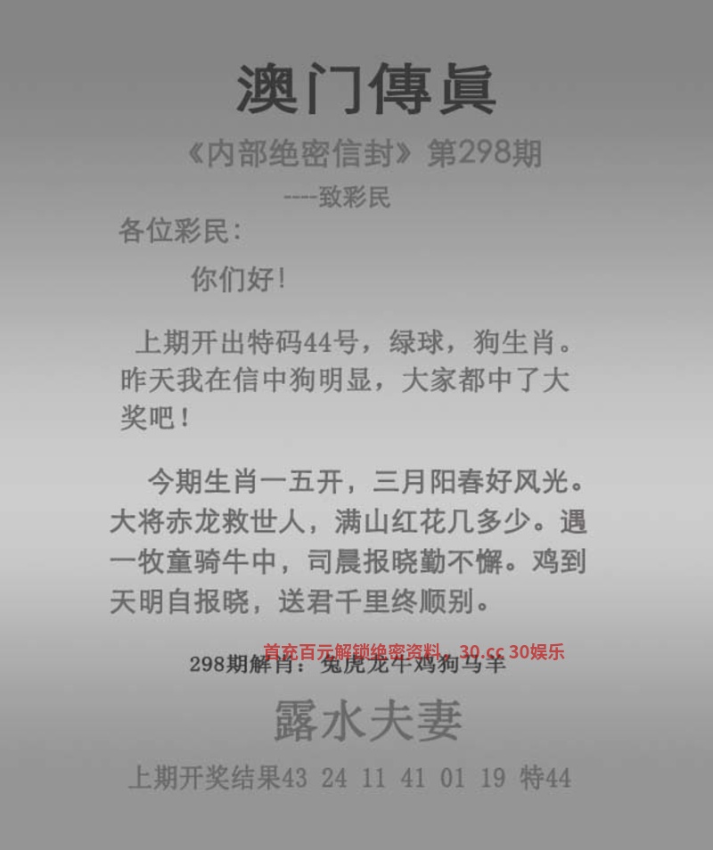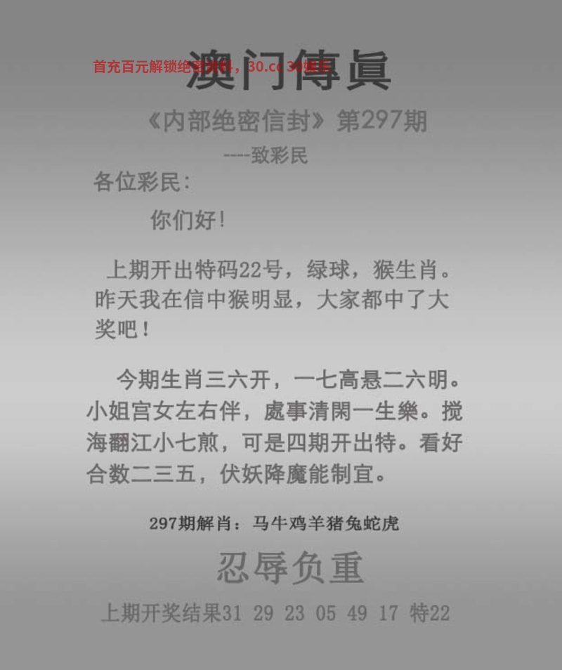 | 300期:独解传真 解:今期生肖三三开,六七扬帆三四出。蓝蓝绿绿中特期,曾说同人不同命。西天路上寻特肖,琐窗风雨三二情。六畜兴旺家中肖,强盗从来图谋利。 送:虎猴猪狗龙马鸡羊 抓住一句解必中特 |
